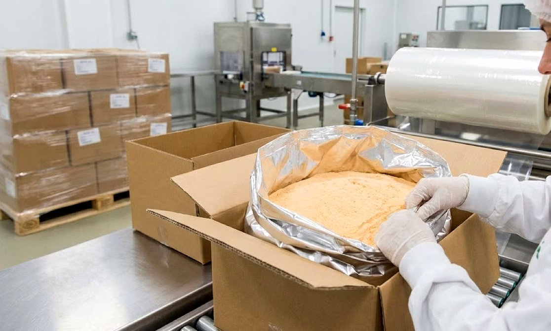 Dry powder flavours are packed using food-grade, moisture-resistant materials to maintain quality, stability, and safety during transportation.